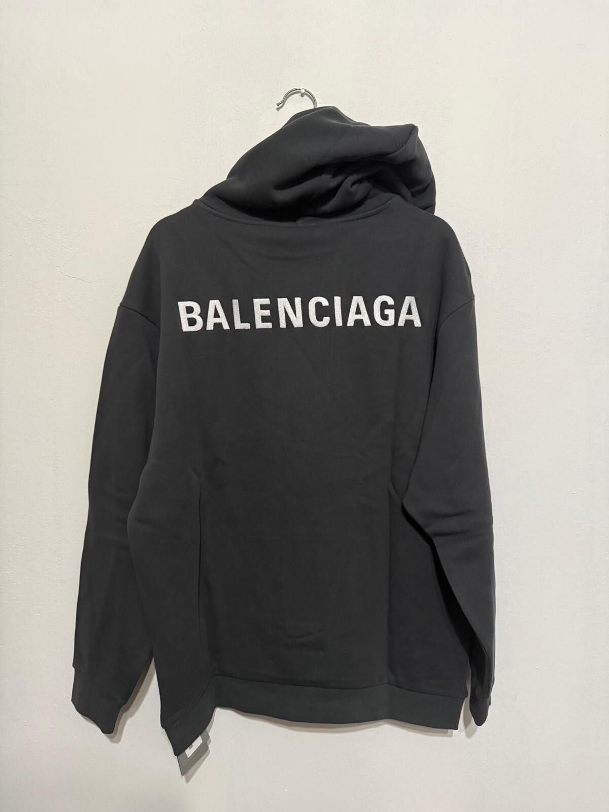 Authentic Balenciaga oversized hoodie in gray featuring the iconic white BALENCIAGA logo boldly across the back. This piece delivers the brand’s signature oversized, relaxed silhouette with a clean and minimal aesthetic.