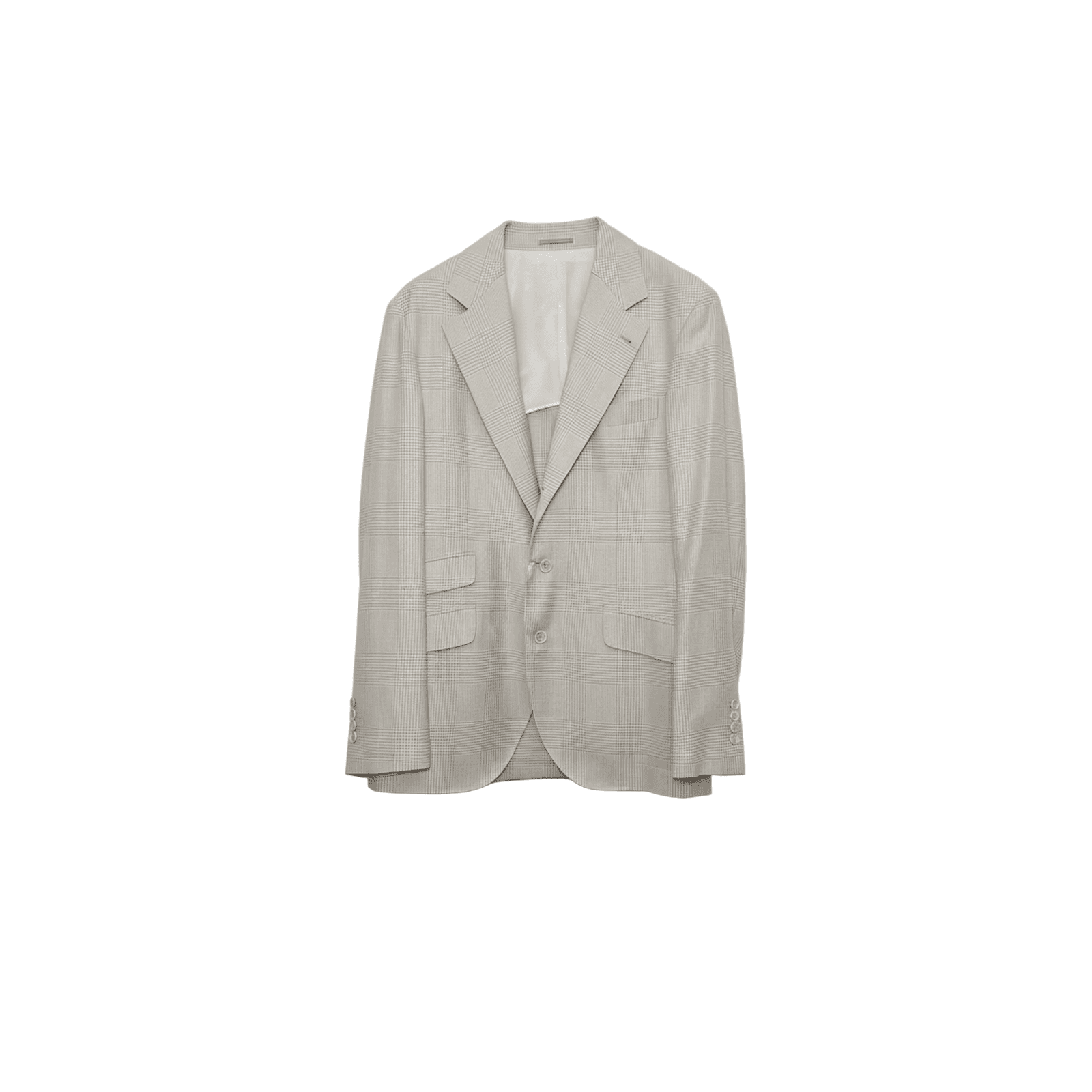 This Brunello Cucinelli suit offers a modern take on formal wear, crafted from a refined fabric featuring a subtle, interwoven pattern. The single-breasted blazer features classic notch lapels and a two-button closure, perfectly complemented by matching trousers for a sophisticated yet versatile ensemble.