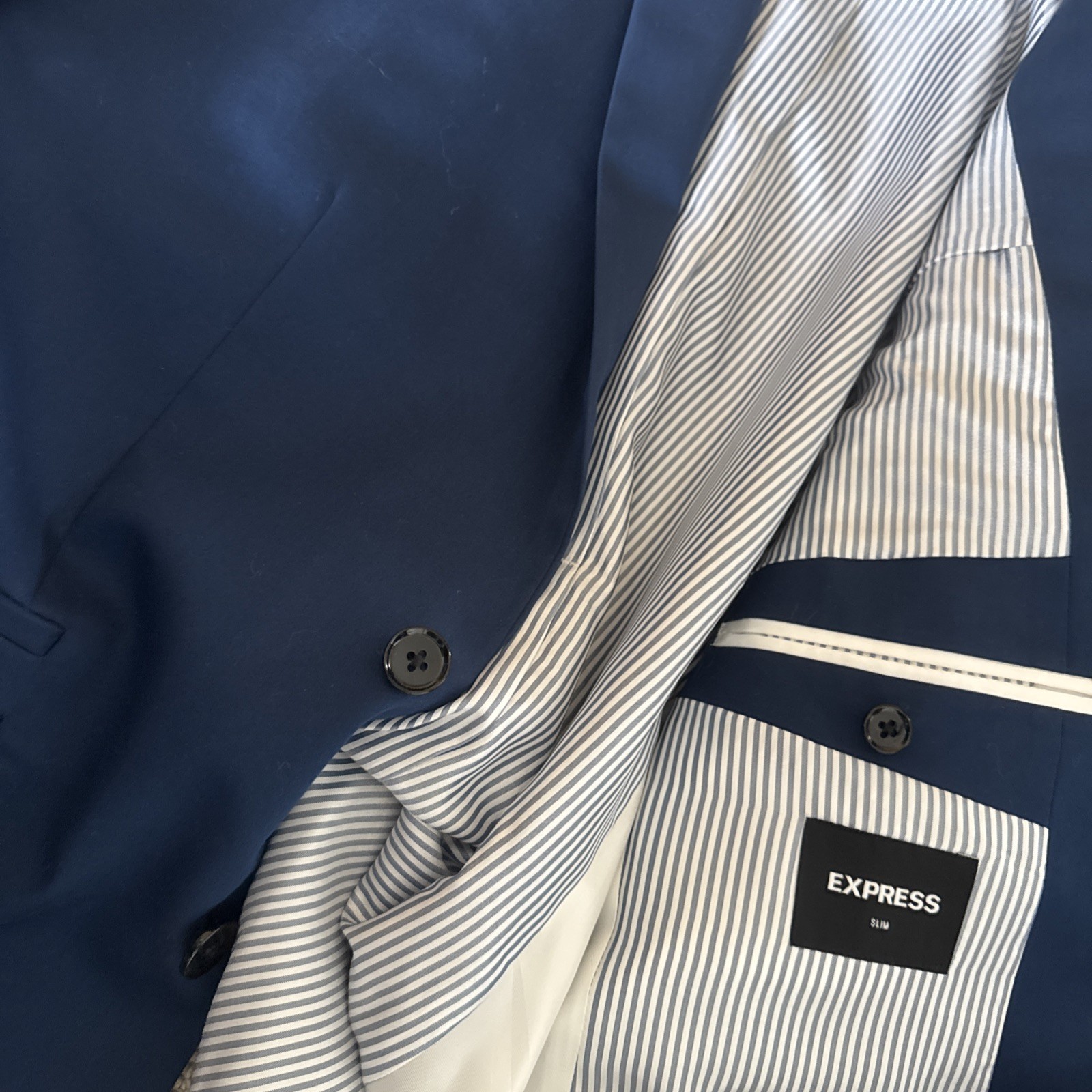 Ships fast, blue express suit jacket folded in shipping bag from a Smoke-free / pet-free home in Clovis California. No refunds!