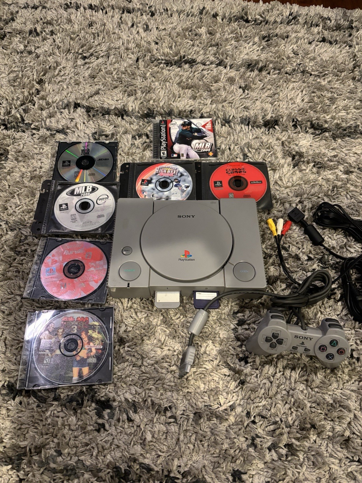 This is an original Sony PlayStation 1 with 2 memory cards, a PlayStation controller and 7 games.